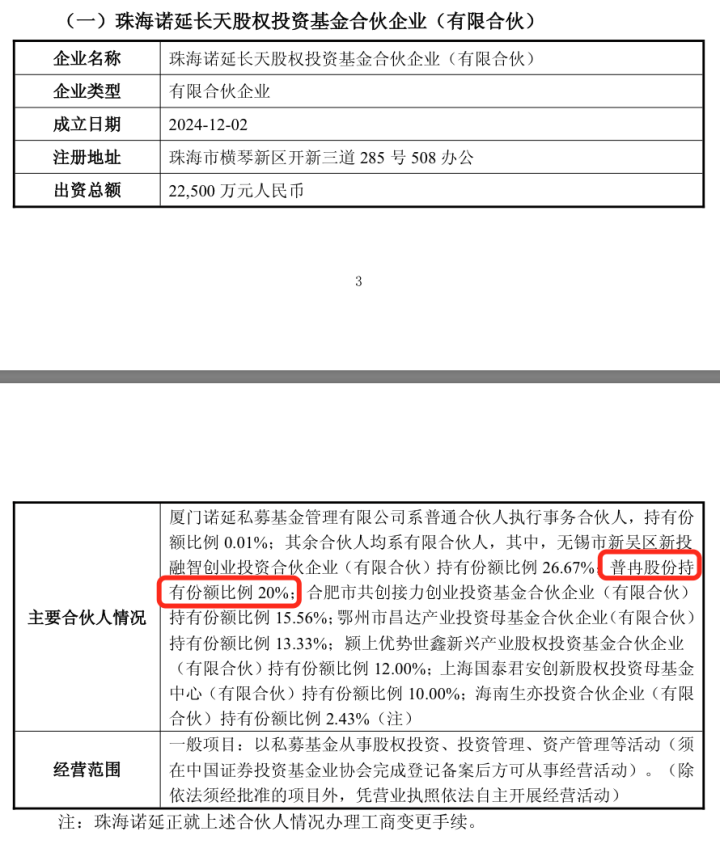 值得注意的是,在珠海诺延的股权结构中,也有普冉股份的身影,其持有20%的份额,作为有限合伙人参与其中。据悉,珠海诺延成立时间为2024年12月。